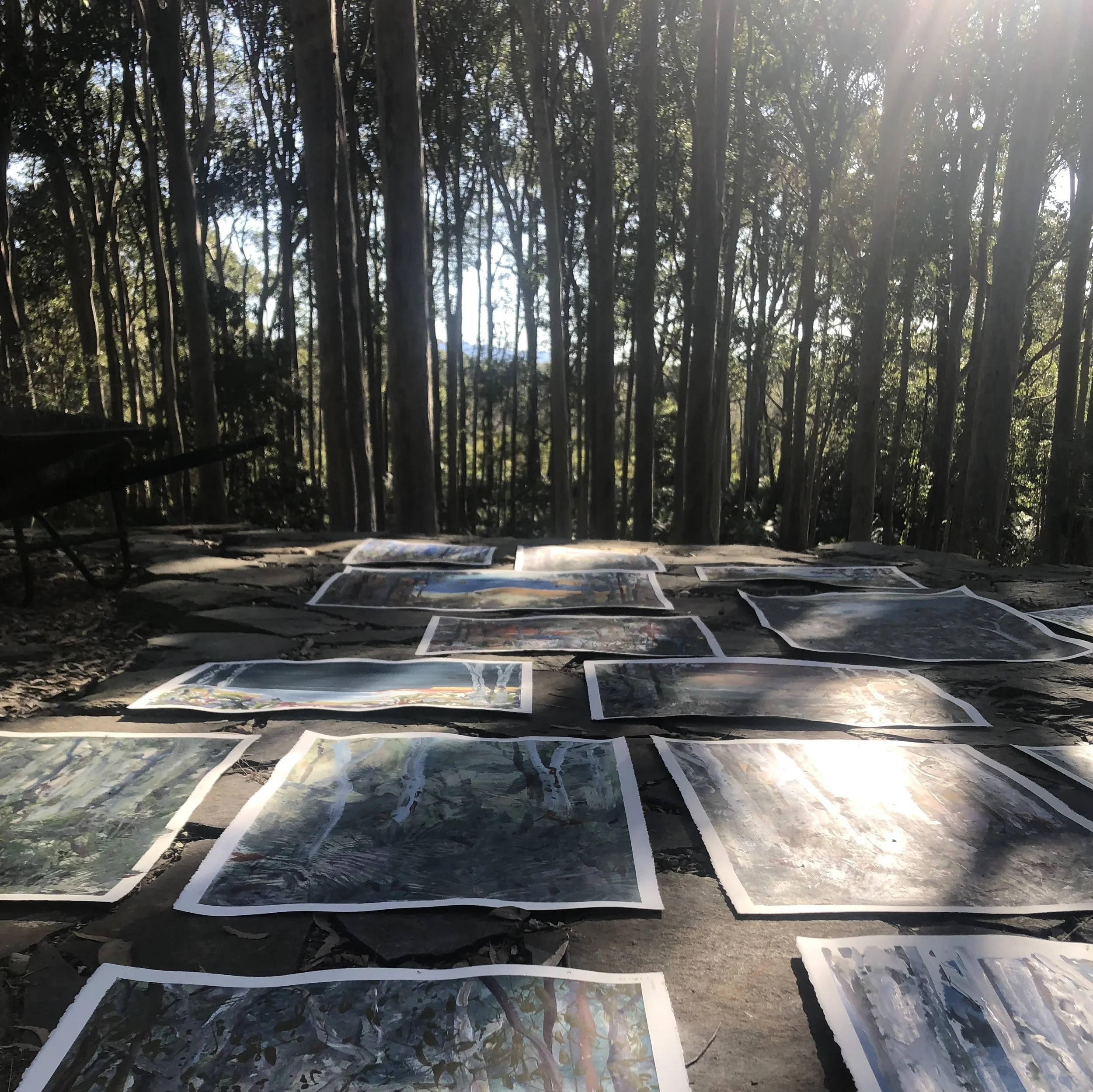 These paintings were produced during a residency at Cuttagee, not far from where I live in Bermagui but a world away, where I was immersed in the place and my practice. The Gang Gang Studio is situated on the traditional lands of the Diringanj people of the Yuin Nation, who lived in harmony with the land for thousands of years. The surrounding spotted gum forest was last month miraculously spared in the encircling October 3rd bushfire. The ocean soars constant in the air, the old wooden bridge, recently withstanding a push to replace it with a concrete freight path, rumbles gently like a slow beat.